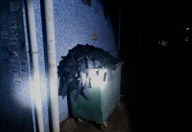 佛山市生态环境局三水分局云东海监督管理所在组织开展夜间执法行动中,发现某家具公司门口生活垃圾桶内堆满了废布边角料等一般工业固废。